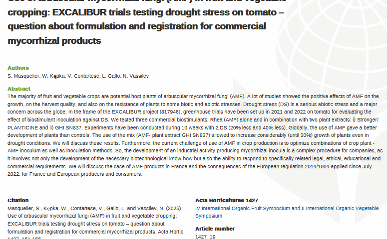 S. Masquelier , W. Kępka , V. Contartese , L. Gallo and N. Vassilev. Use of arbuscular mycorrhizal fungi (AMF) in fruit and vegetable cropping: EXCALIBUR trials testing drought stress on tomato – question about formulation and registration for commercial mycorrhizal products. Acta Hortic. 1427. ISHS 2025. DOI 10.17660/ActaHortic.2025.1427.19 Proc. IV Int. Organic Fruit Symposium and II Int. Organic Vegetable Symposium
